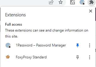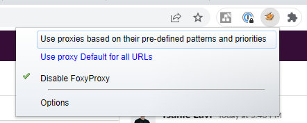 b. Alternatively, you can use FoxyProxy’s quick menu to activate the proxy from any page. Click on the FoxyProxy icon in the toolbar, and then select your proxy profile.