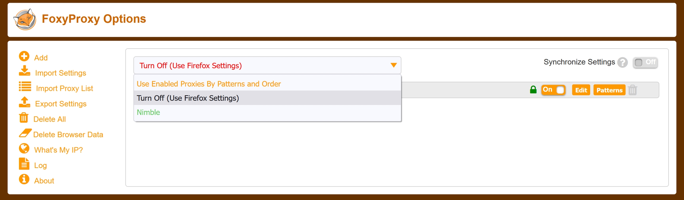 a. From the FoxyProxy options page, change “Turn Off (Use Firefox Settings)” to the title you set for your proxy profile (we used “Nimble”).