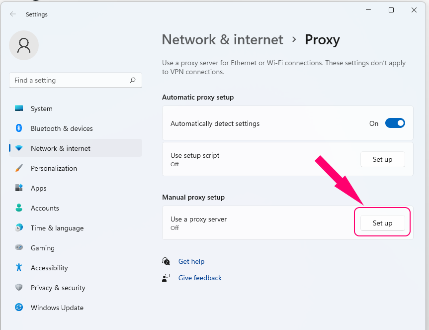 2. There are two ways to set up a proxy; by script or manually. In this guide, we’ll set up the proxy manually - click on “Set up” to add a proxy server and port.