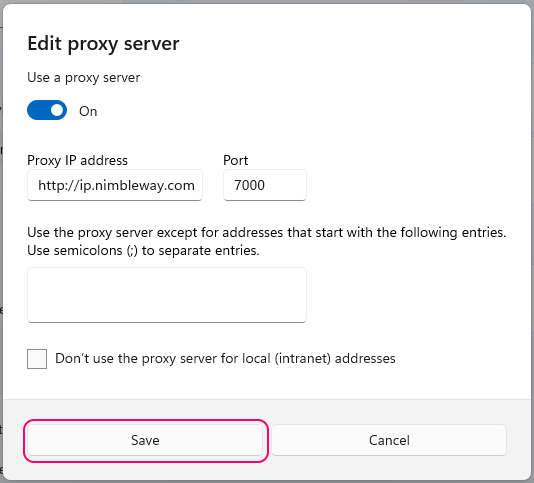 Configuring Windows to work with Nimble IP allows any running application to use the proxy connection for its communication over the internet.